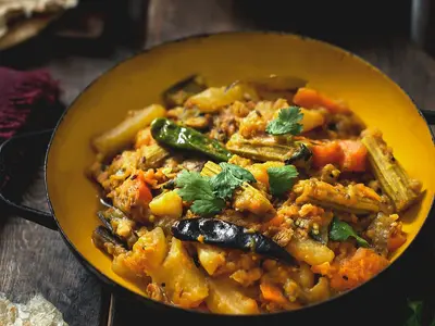 A spicy stir-fry of assorted seasonal vegetables cooked with herbs and spices.